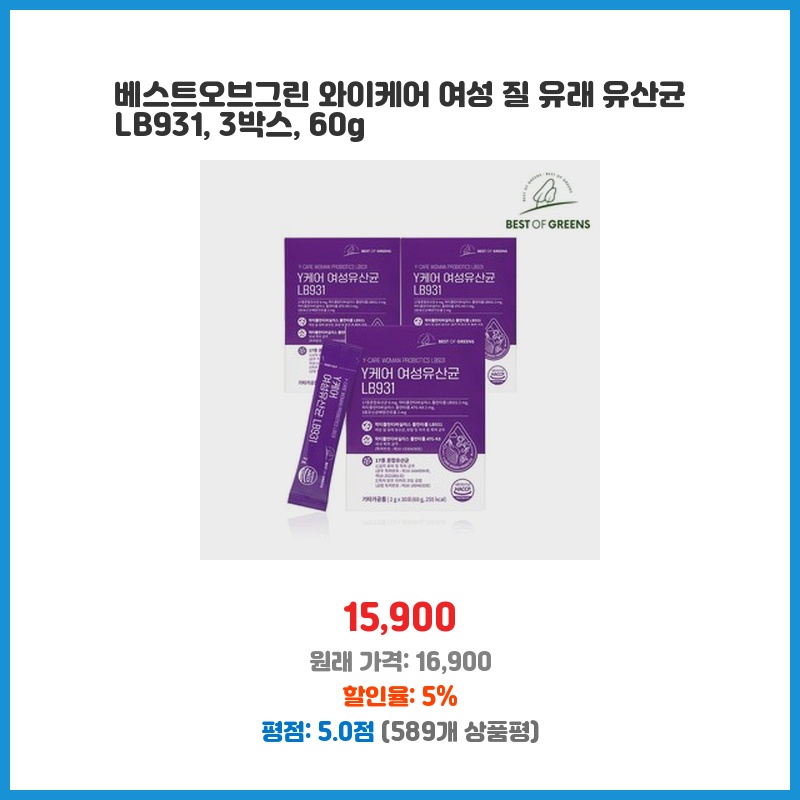 베스트오브그린 와이케어는 질 건강에 놀라운 변화를 가져왔어요. 유산균 LB931이 질의 pH 균형을 조절해 불쾌한 증상을 완화해주는 것 같아요. 3박스를 사용했고, 지금은 자신감이 생겼어요!