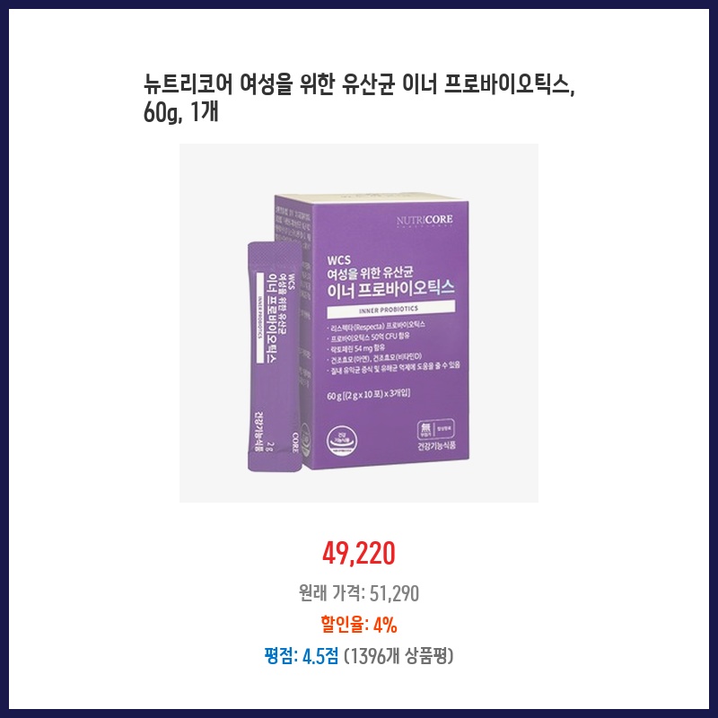 여성 건강에 필수적인 유산균을 보충하기 위해 이 제품을 구매했습니다. 60g 용량으로 2개월 분이며, 여성 특유의 질환 예방에 도움이 되는 프로바이오틱스 균주를 함유하고 있습니다. 또한, 효과적인 유산균 보충을 위한 최적의 환경을 제공하는 프리바이오틱스를 포함하고 있어 장 건강을 유지하는 데 도움이 될 것으로 기대합니다.