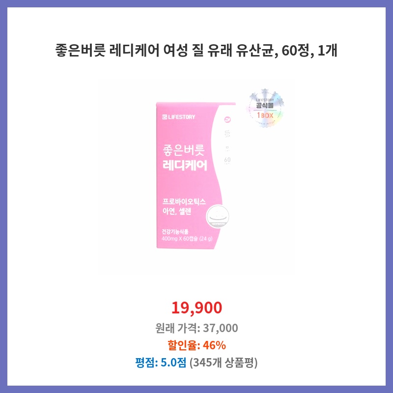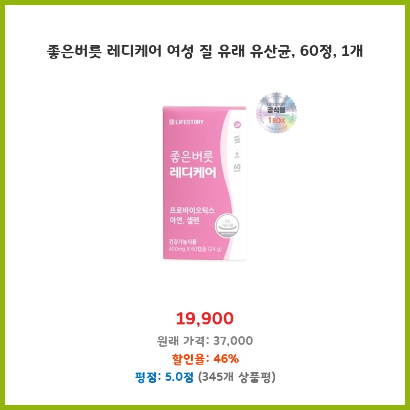 질 건강을 개선하고 싶어서 구매했습니다. 좋은버릇 레디케어는 여성 질에서 분리한 유산균을 함유하여 질내 pH 균형을 유지하고, 질염과 같은 질 문제 예방에 도움이 된다고 합니다. 또한, 60정으로 2개월 분량이므로 비용 대비 효율도 좋습니다.