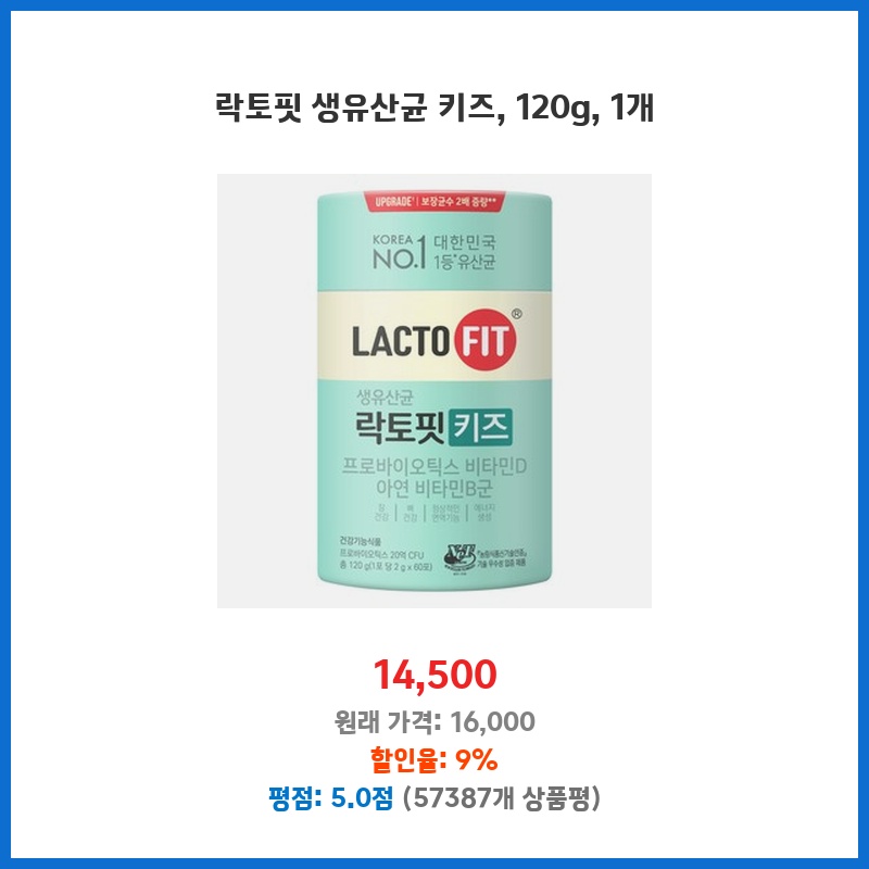 아이가 유산균을 꾸준히 섭취해야 한다고 생각해서 구매했습니다. 락토핏 키즈는 맛도 좋고, 120g 대용량이라 오래 먹일 수 있어 경제적입니다. 2개 구매로 더욱 저렴하게 구입했습니다.