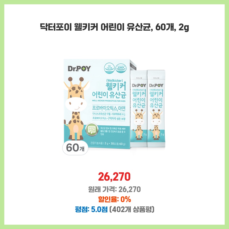 아이가 유산균을 잘 안 먹어서 고민이었는데, 닥터포이 웰키커는 맛있다고 잘 먹네요. 2g 개별 포장이라 휴대도 간편하고, 어린이 유산균이라 안심하고 먹일 수 있어 구매했습니다.